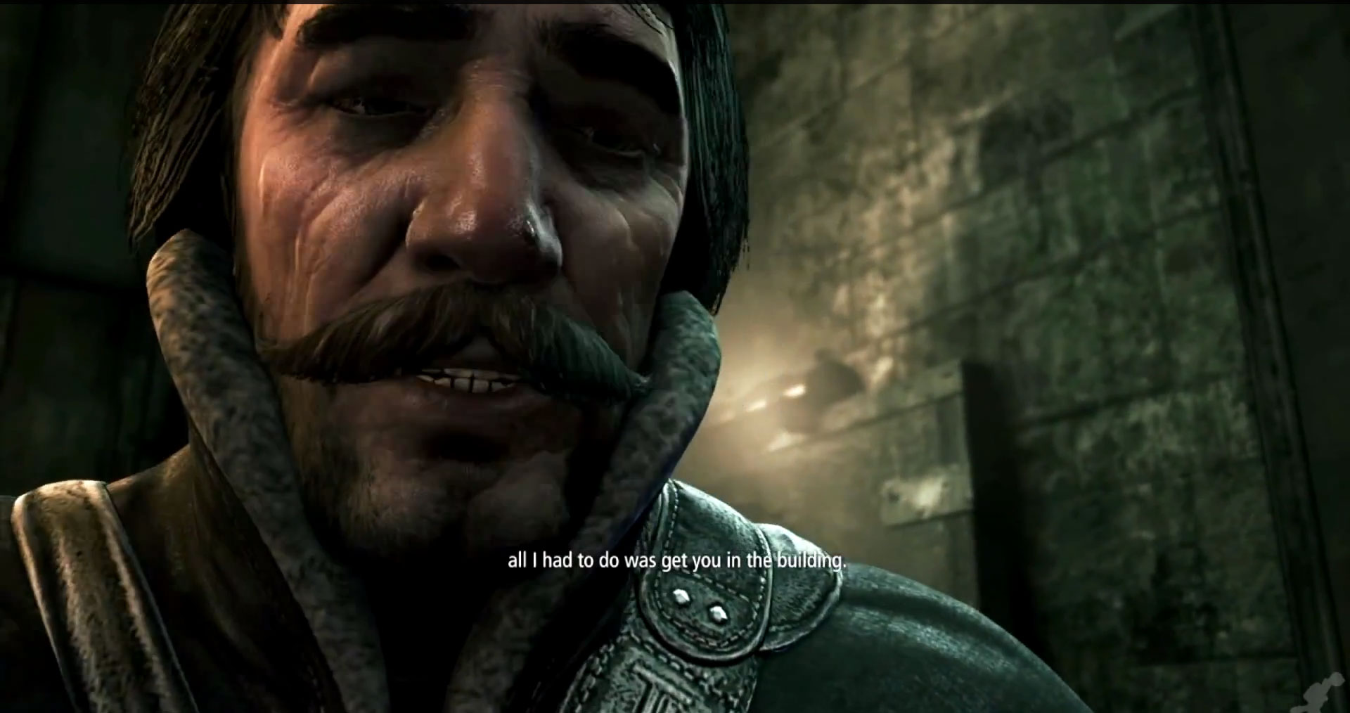 Garrett who was just ahead making sure all the guards were dead, stops at this comment. It almost looks as if Garrett is going to say ‘I’m sorry’ as he turns to Basso, but the words don’t come. They aren’t needed. Just the look of regret on Garrett’s face is enough. Basso is devastated. He’d always planned on killing the bird himself but even that’s been taken away. That Garrett realizes how much the stupid bird meant to Basso shows another side of his character.